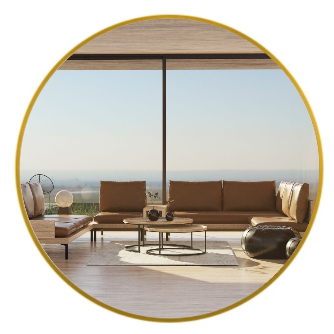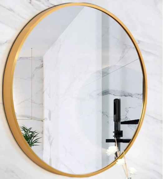 Okrągłe lustro w złotej szczotkowanej aluminiowej ramie pasujące do salonu, łazienki czy biura.